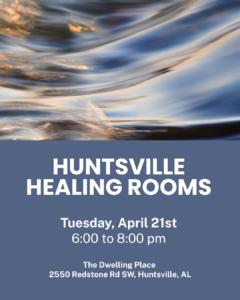 Huntsville Healing Rooms is open from 6:00-8:00pm on the third Tuesday of each month. Sessions are free, open o the public, and are first come first serve. Childcare is not provided.