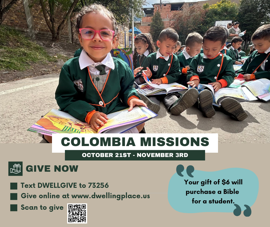 Pastors Patrick & Andrea will be leading a small team to Colombia in October. Please give your best gift today to support this mission. On this trip, they will be sharing the love of Christ in schools, retirement homes, and churches. Your donation of as $6.00 will purchase a Bible for a student in Colombia. Together we are making a difference.